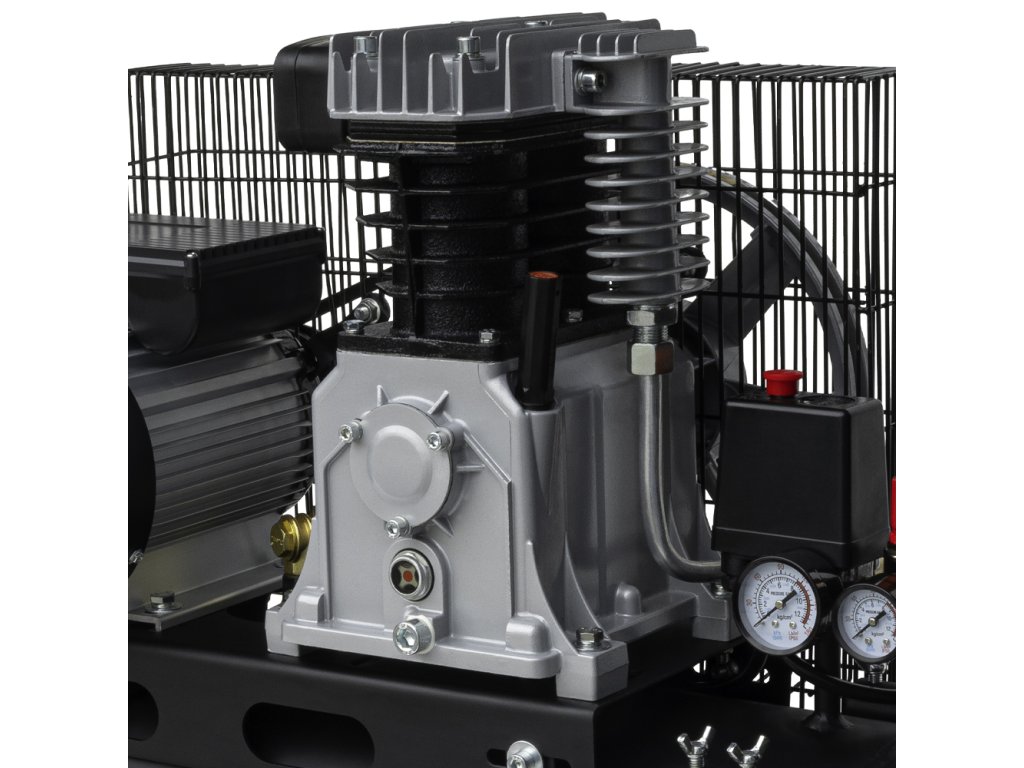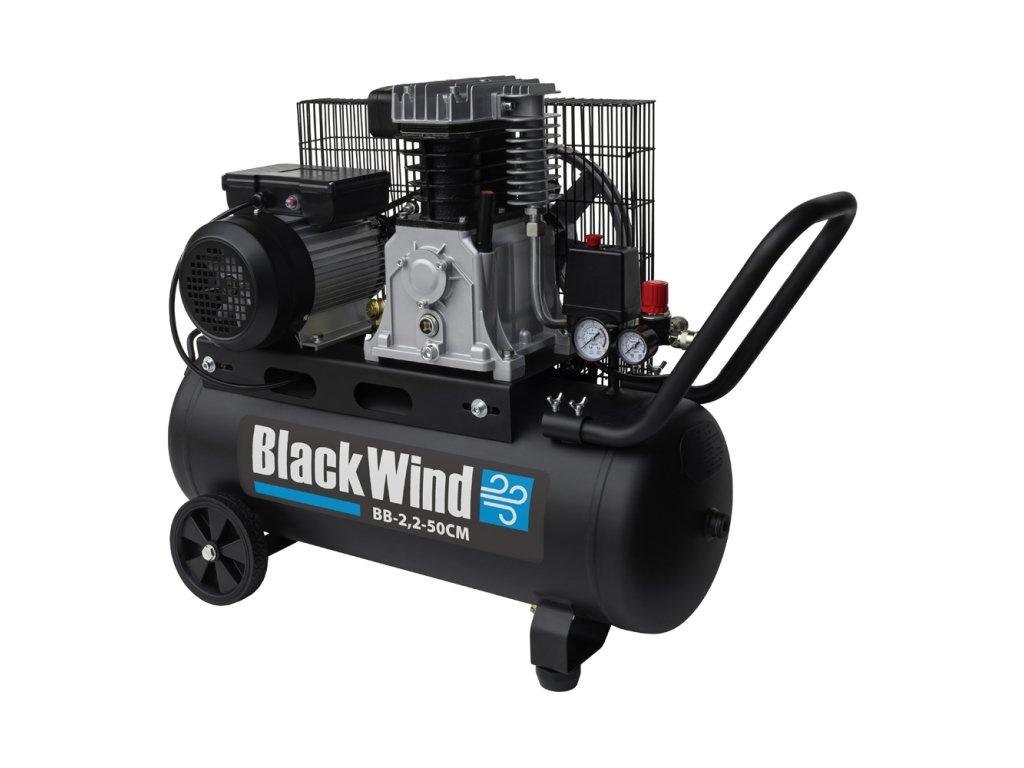 Pojízdný kompresor Black Wind BB s pohonem pomocí klínového řemene s nízkými otáčkami na kompresorové jednotce pro zajištění vyššího výtlačného výkonu. Olejem mazaný stroj s příkonem 2,2 kW a se sacím výkonem 320 l/min je ve standardu dodáván s následujícím vybavením: