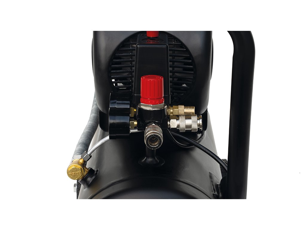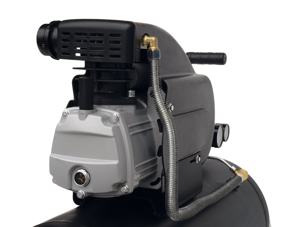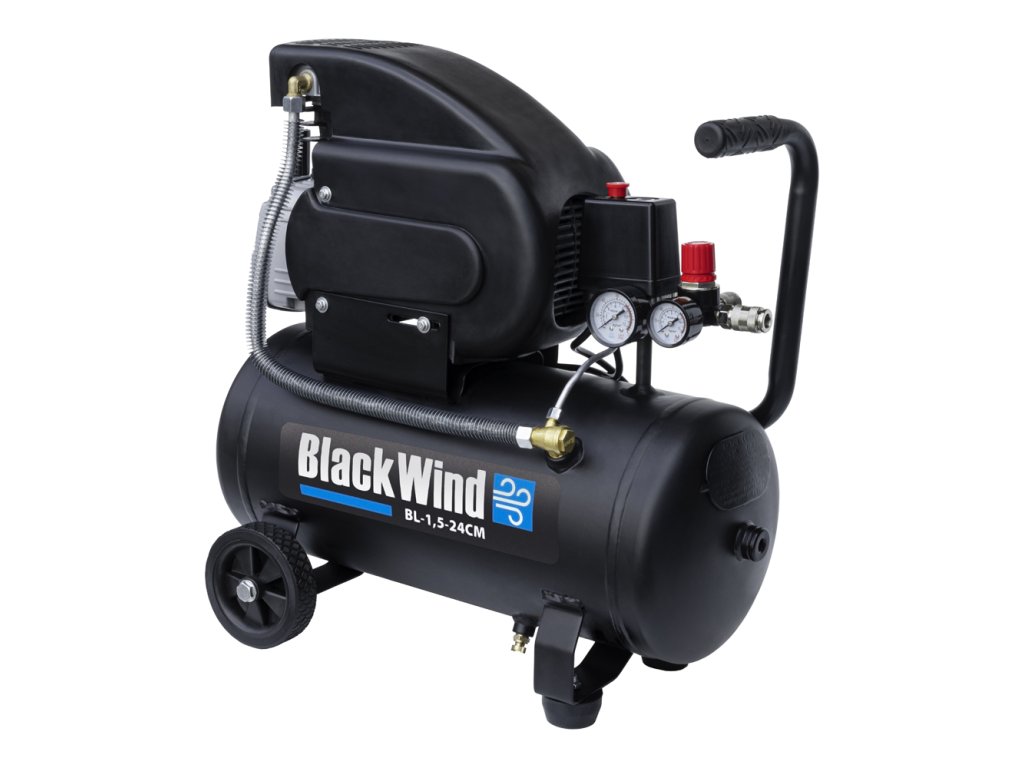 Malý pojízdný kompresor Black Wind BL v olejem mazaném provedení s přímým spojením elektromotoru s kompresorovou jednotkou. Stroj s příkonem 1,5 kW a se sacím výkonem 200 l/min je ve standardu dodáván s následujícím vybavením: