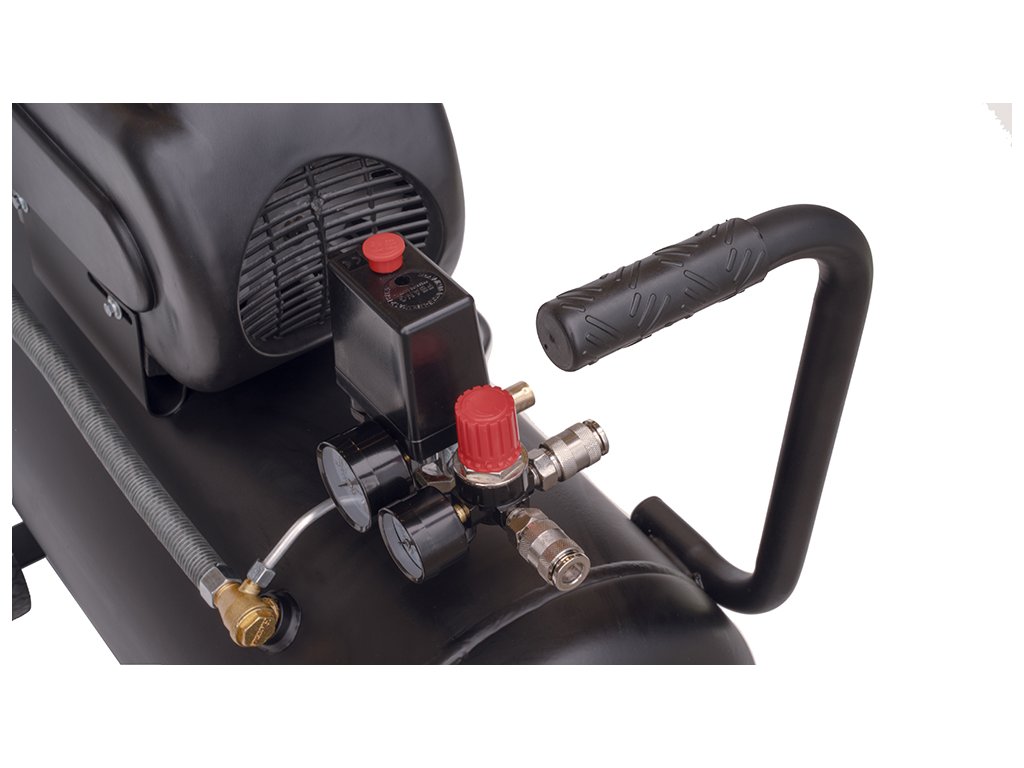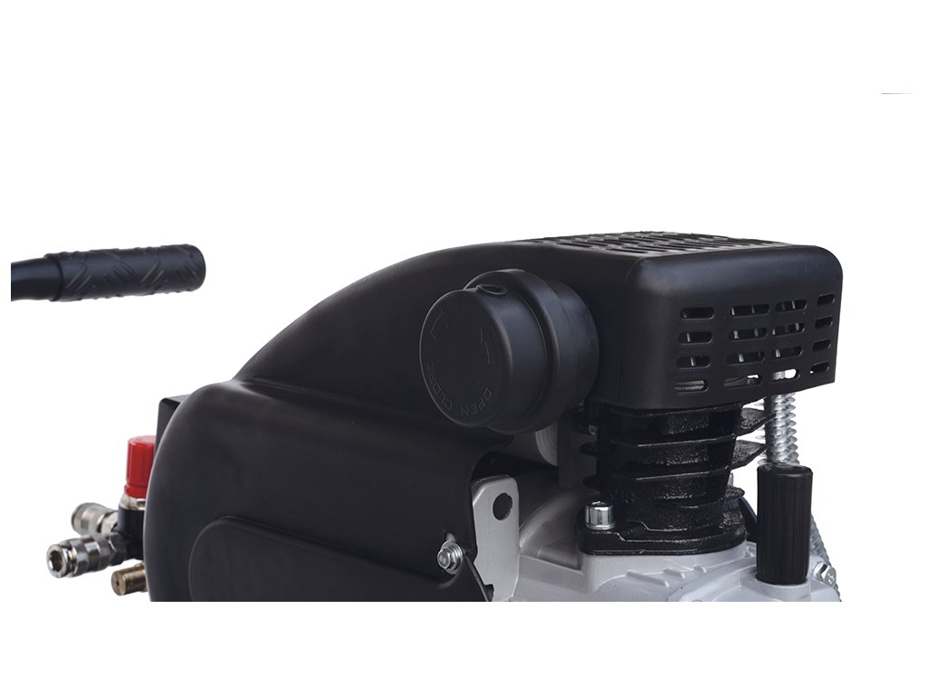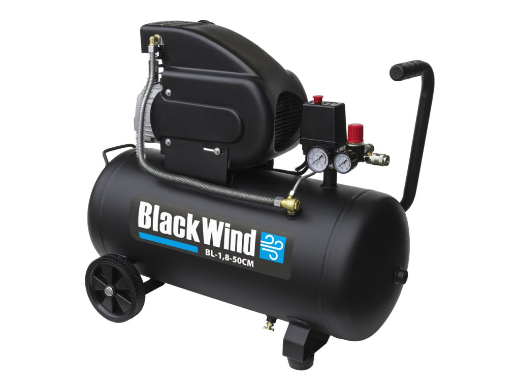 Malý pojízdný kompresor Black Wind BL v olejem mazaném provedení s přímým spojením elektromotoru s kompresorovou jednotkou. Stroj s příkonem 1,8 kW a se sacím výkonem 233 l/min je ve standardu dodáván s následujícím vybavením:
