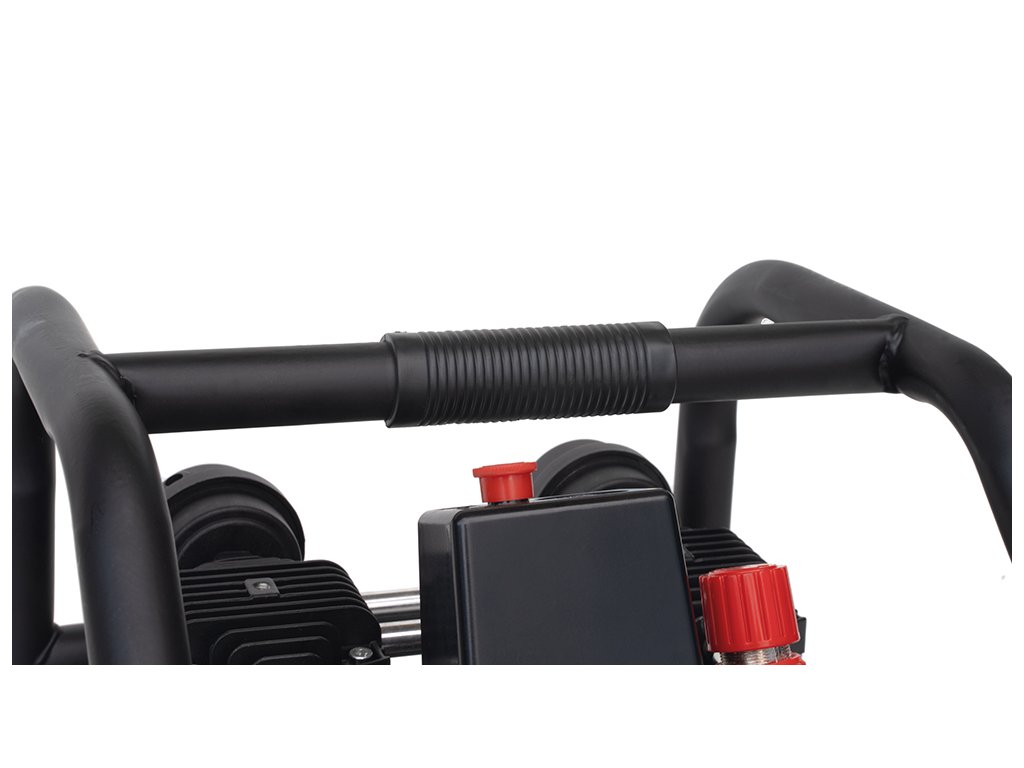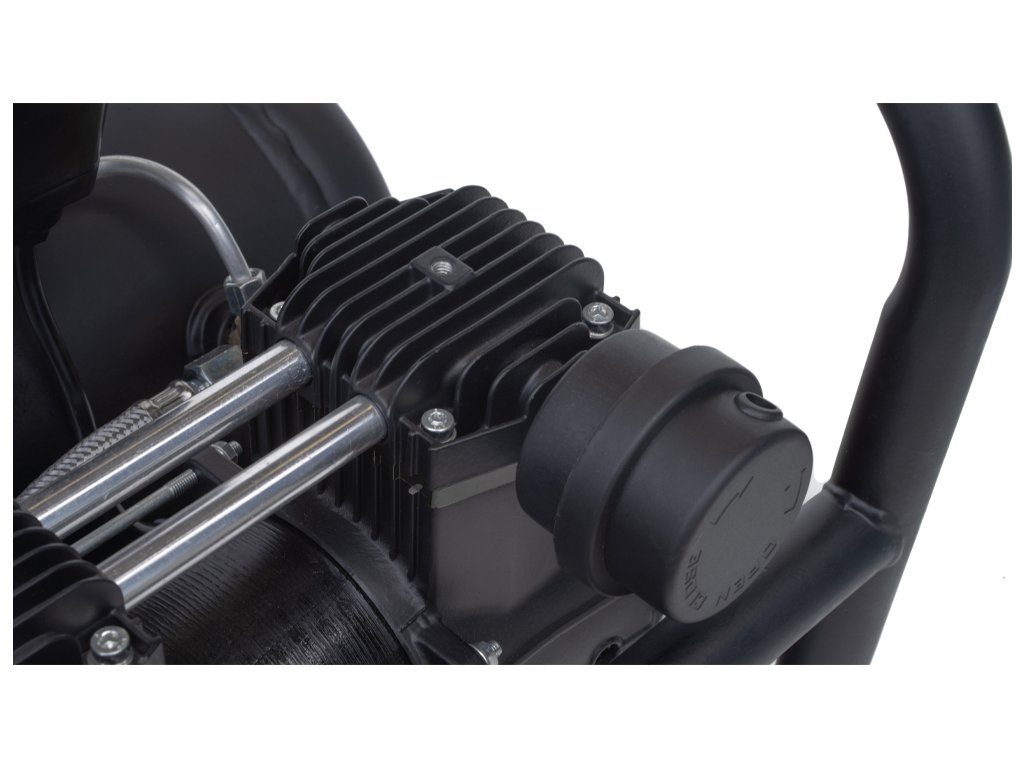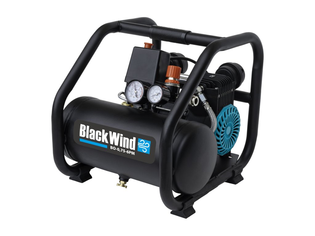 Malý přenosný kompresor Black Wind BO v bezolejovém provedení s inovativním konceptem přímého spojení centrálního elektromotoru se dvěma kompresorovými jednotkami pro extrémní snížení hlučnosti. Stroj se sacím výkonem 160 l/min je ve standardní verzi dodáván s následujícím vybavením: