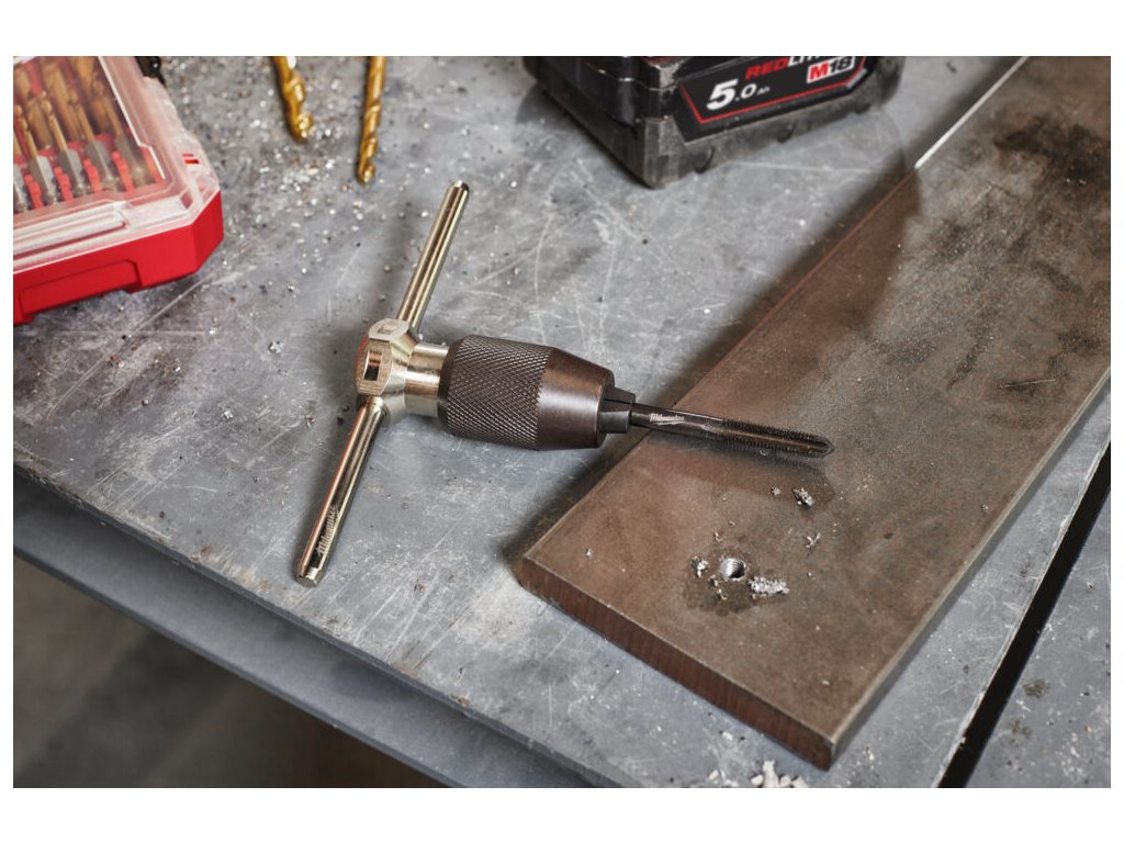 - Obsahuje precizně opracované závitovací příslušenství a rukojeti pro nejběžnější použití.