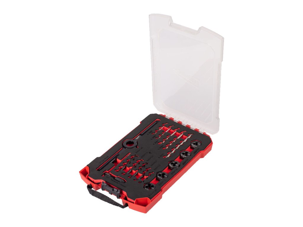 Obsahuje: Závitníky se žlábkem M3–0,50 mm, M4–0,70 mm, M5–0,80 mm, M6–1,00 mm, M8–1,25 mm / závitová oka 1˝ Hex M3–0,50 mm, M4–0,70 mm, M5–0,80 mm, M6–1,00 mm, M8–1,25 mm / vrtáky 2,5 mm, 3,3 mm, 4,2 mm, 5,0 mm, 6,8 mm / T-rukojeť / držák závitových ok 1˝ Hex